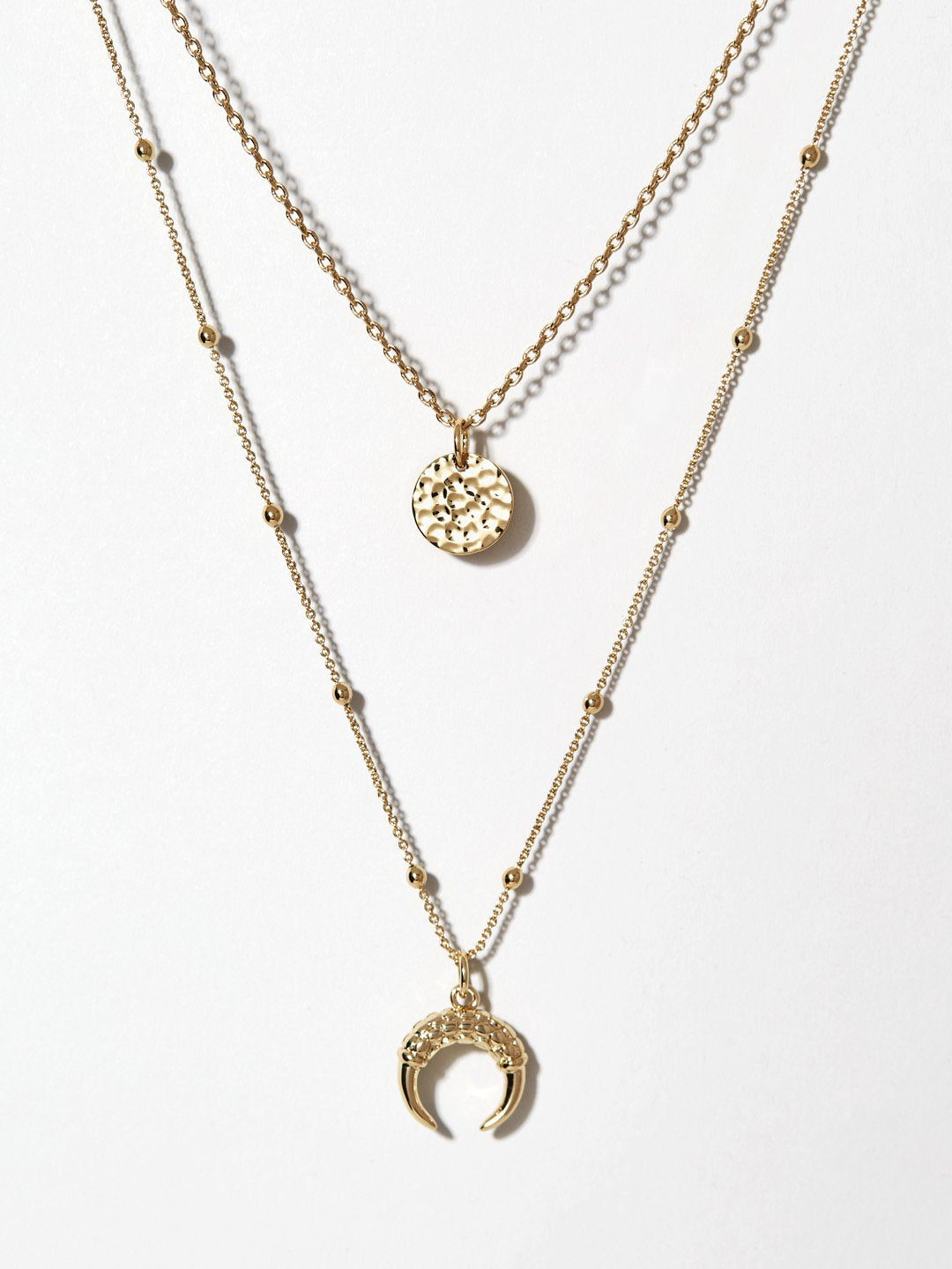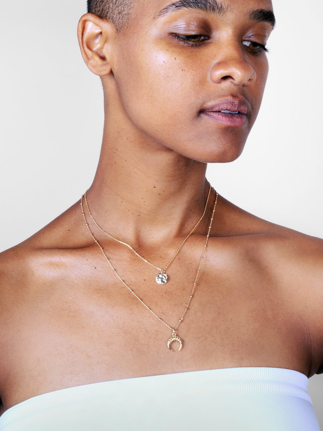 Get fab with a gold layered necklace set featuring two of our best-selling designs, the gold horn pendant, and the textured coin necklace. Chic, elegant and very creative, this layered necklace set will become your next favorite jewelry piece. Wear it with a solid off-white crop top, a pair of high-waist jeans and gold flat sandals to get a fashionable & gorgeous look.