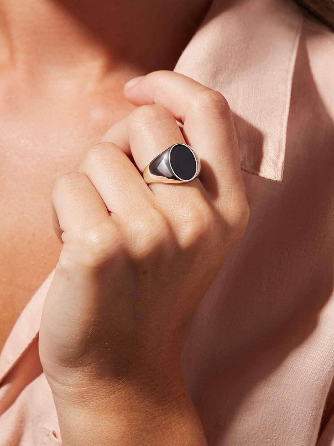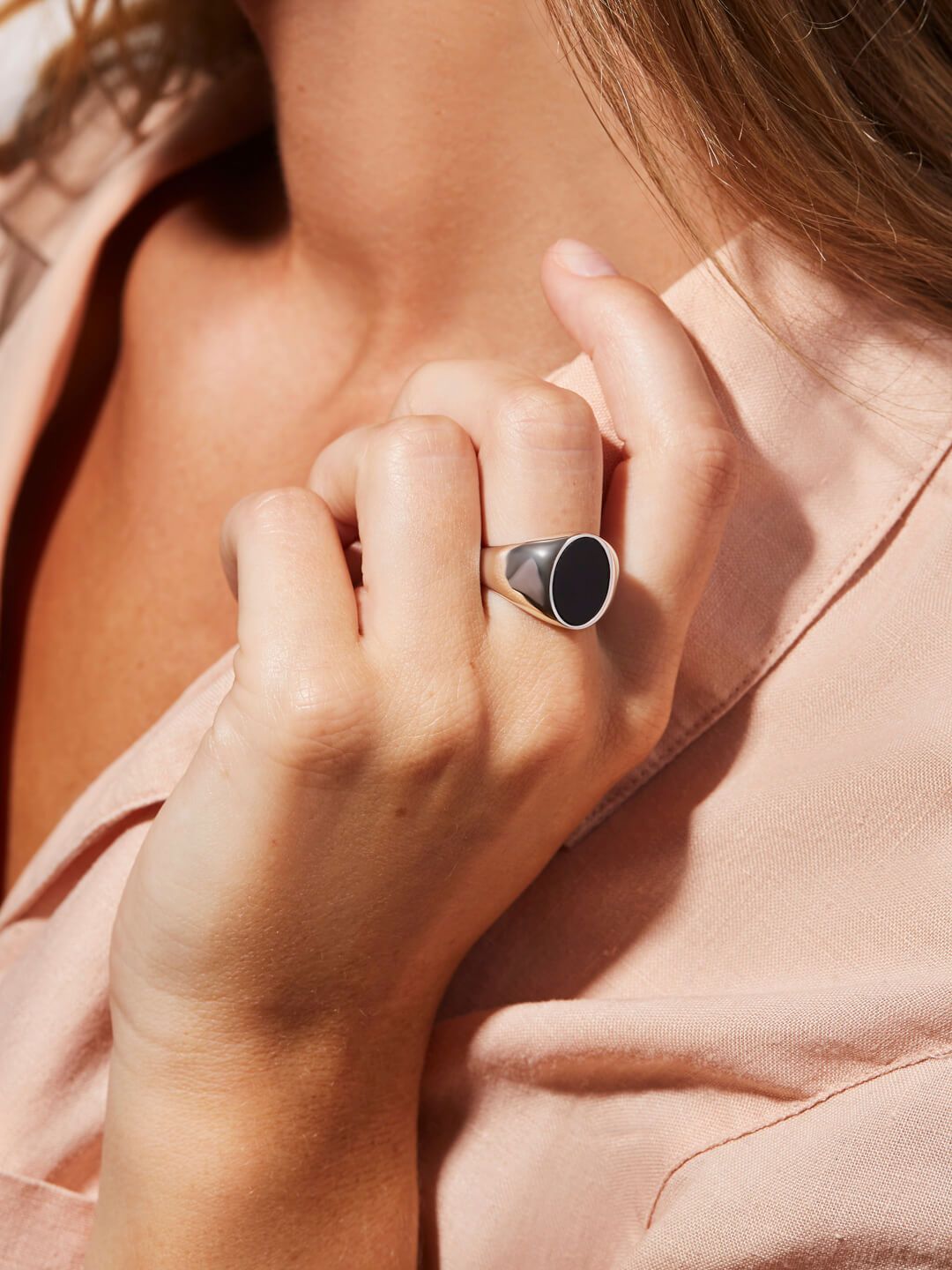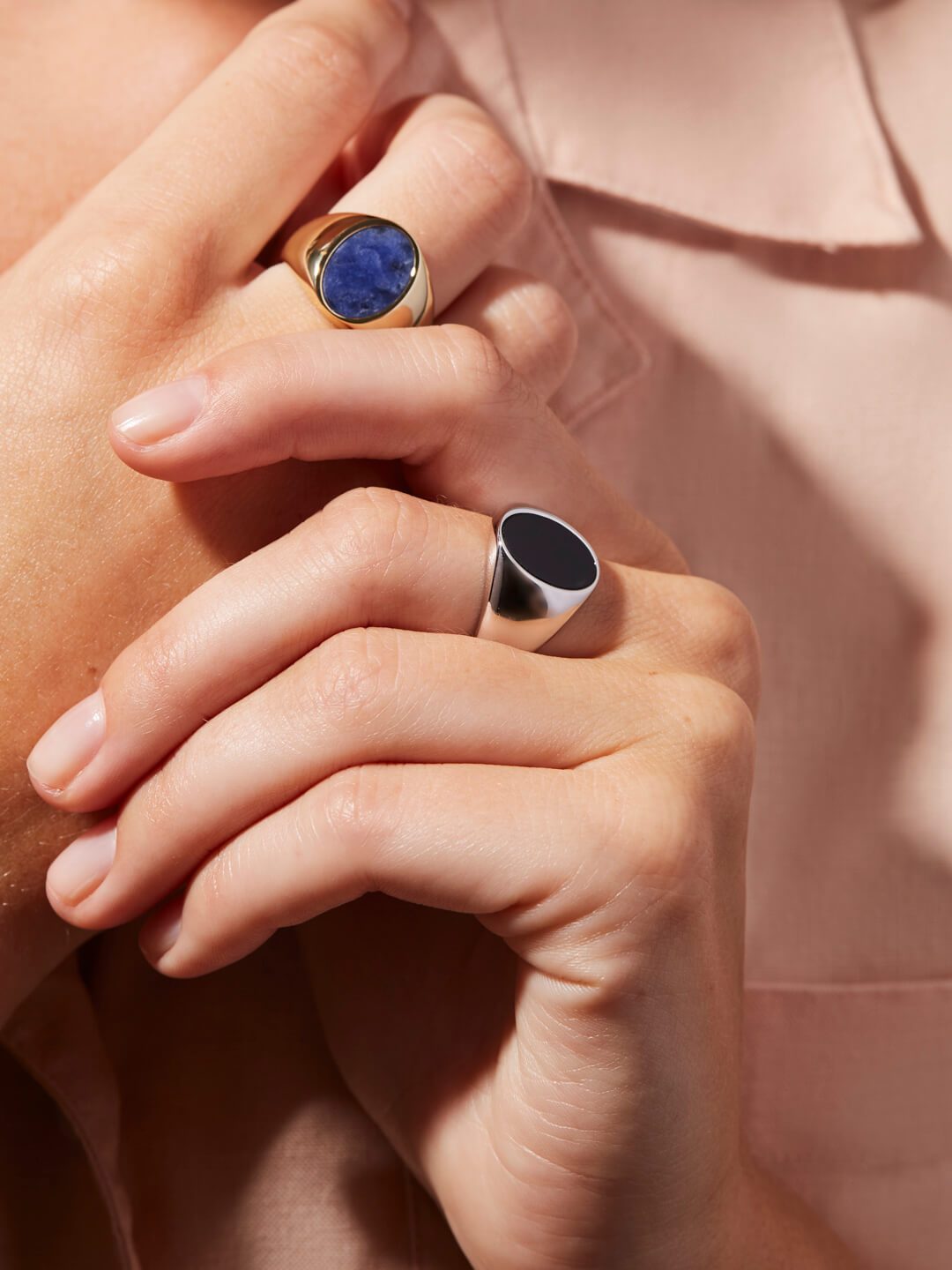 Power up your ring game with this silver oval signet ring featuring a glossy black onyx gem. Perfect for cocktail parties and office days as well, this black onyx ring has a unique futuristic vibe. This silver signet ring is also available in gold, and features a Sodalite gem. Offer yourself a bold present and make sure to get this gorgeous signet ring before it’s out of stock.