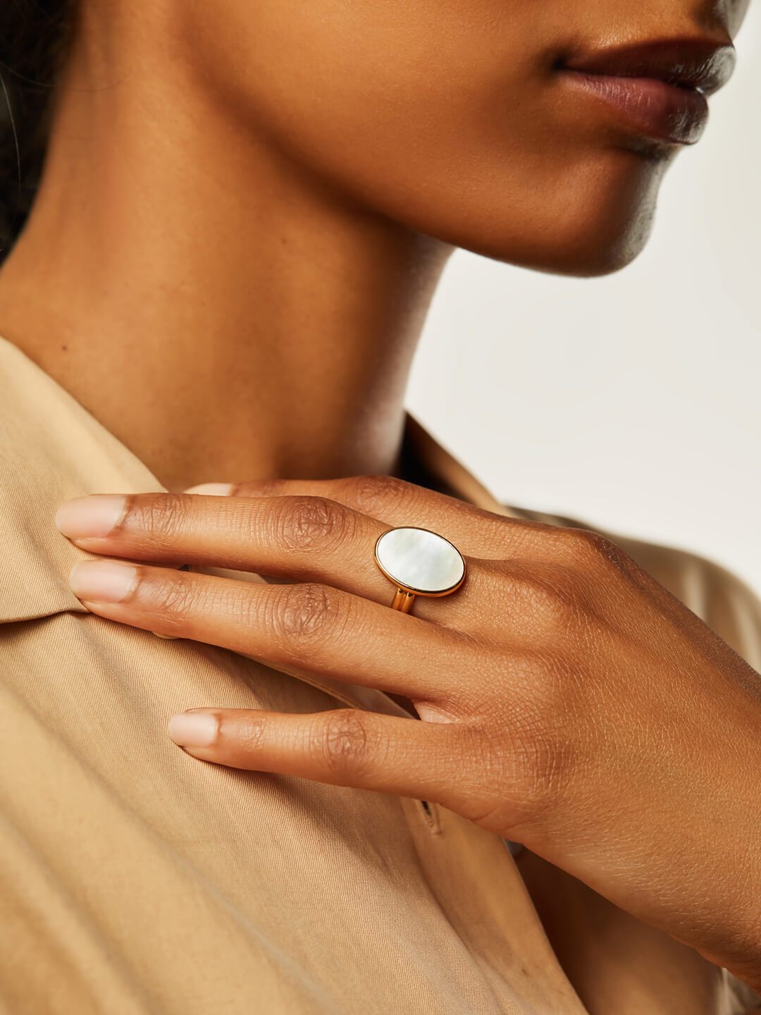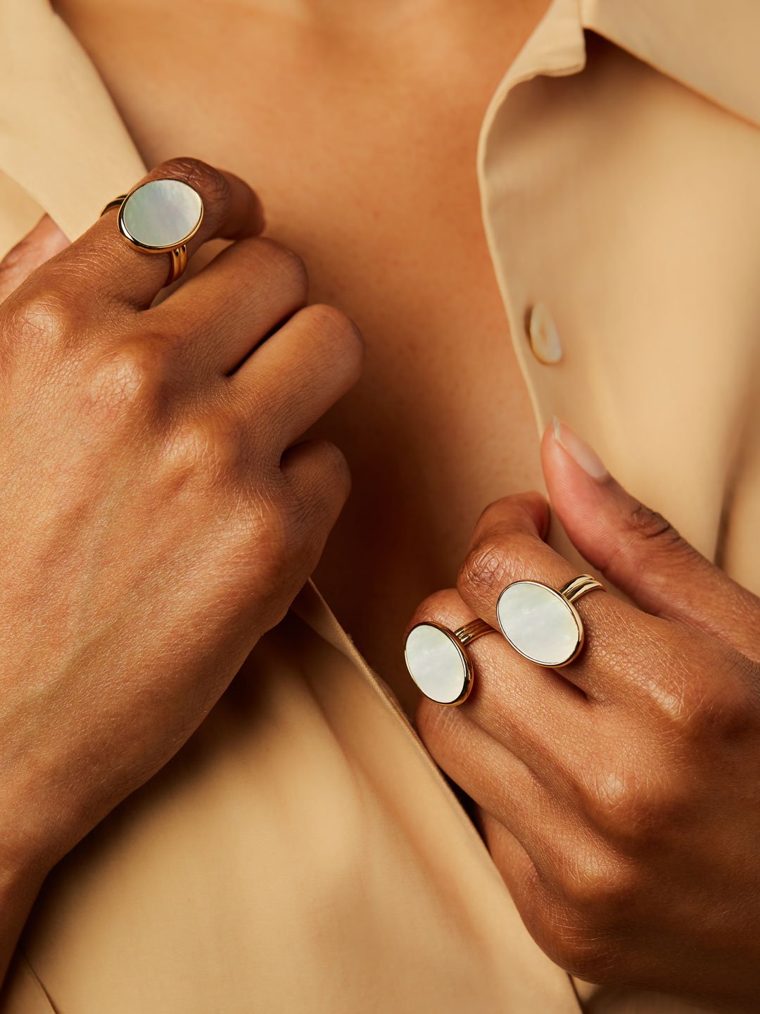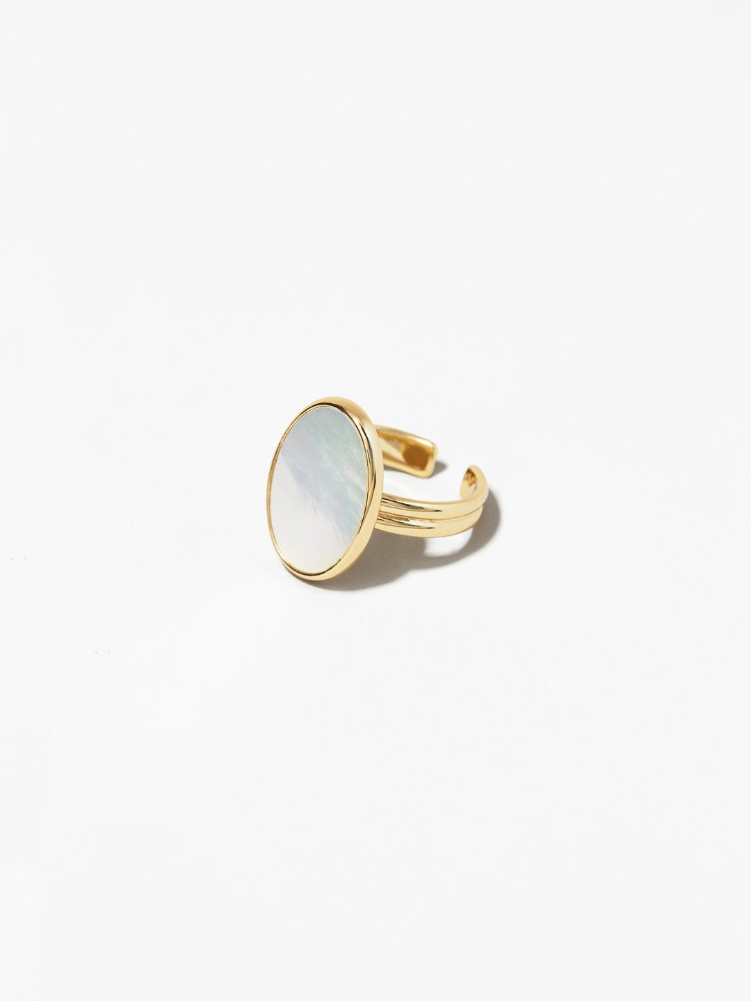 This lustrous and iridescent Mother-of-Pearl disc on an adjustable band makes this oval stone ring an instant classic. Dipped in 14k gold and featuring a central Mother-of-Pearl gem, this oval stone ring is the perfect finishing touch to a sleek look. Add it to your shopping bag before it’s gone and have fun styling it with your other gemstone pieces.
