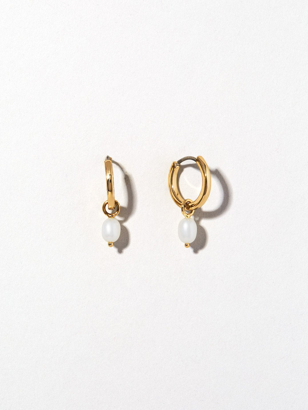 Hear the buzzing sound? That’s your ear lobes begging you to get these extra-stylish gold huggie hoops with a natural pearl charm. With a lustrous freshwater pearl charm and a luscious gold texture, these gold huggie hoop earrings are guaranteed to become your next jewelry obsession.