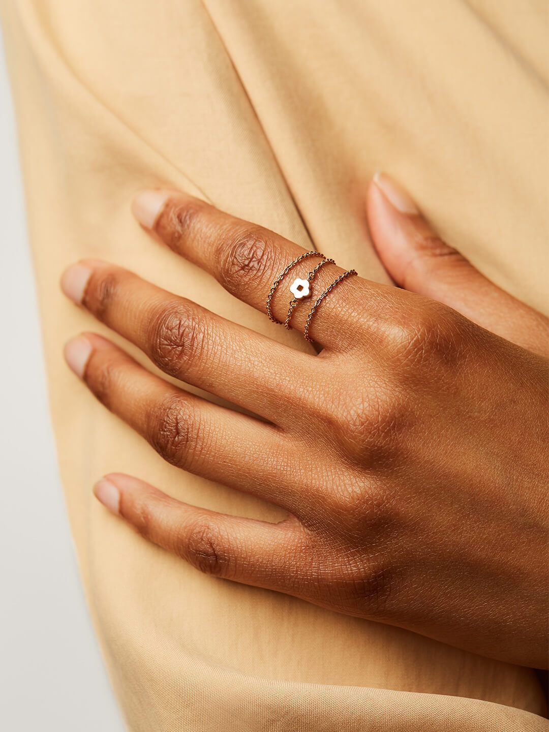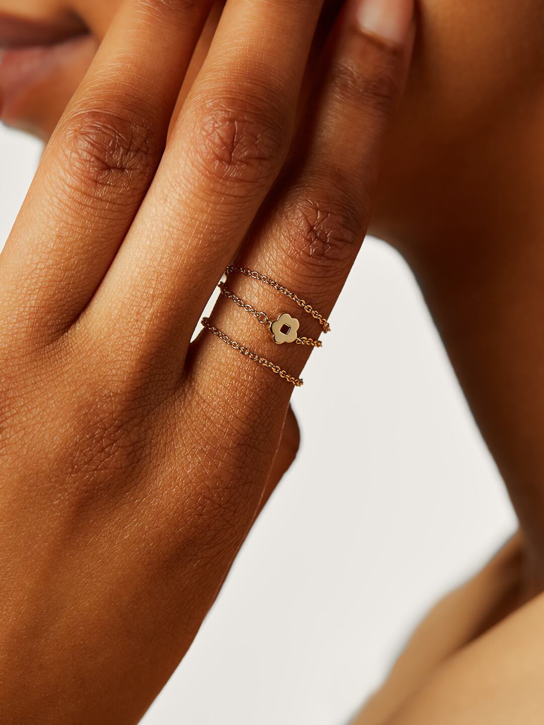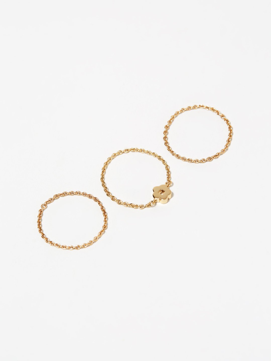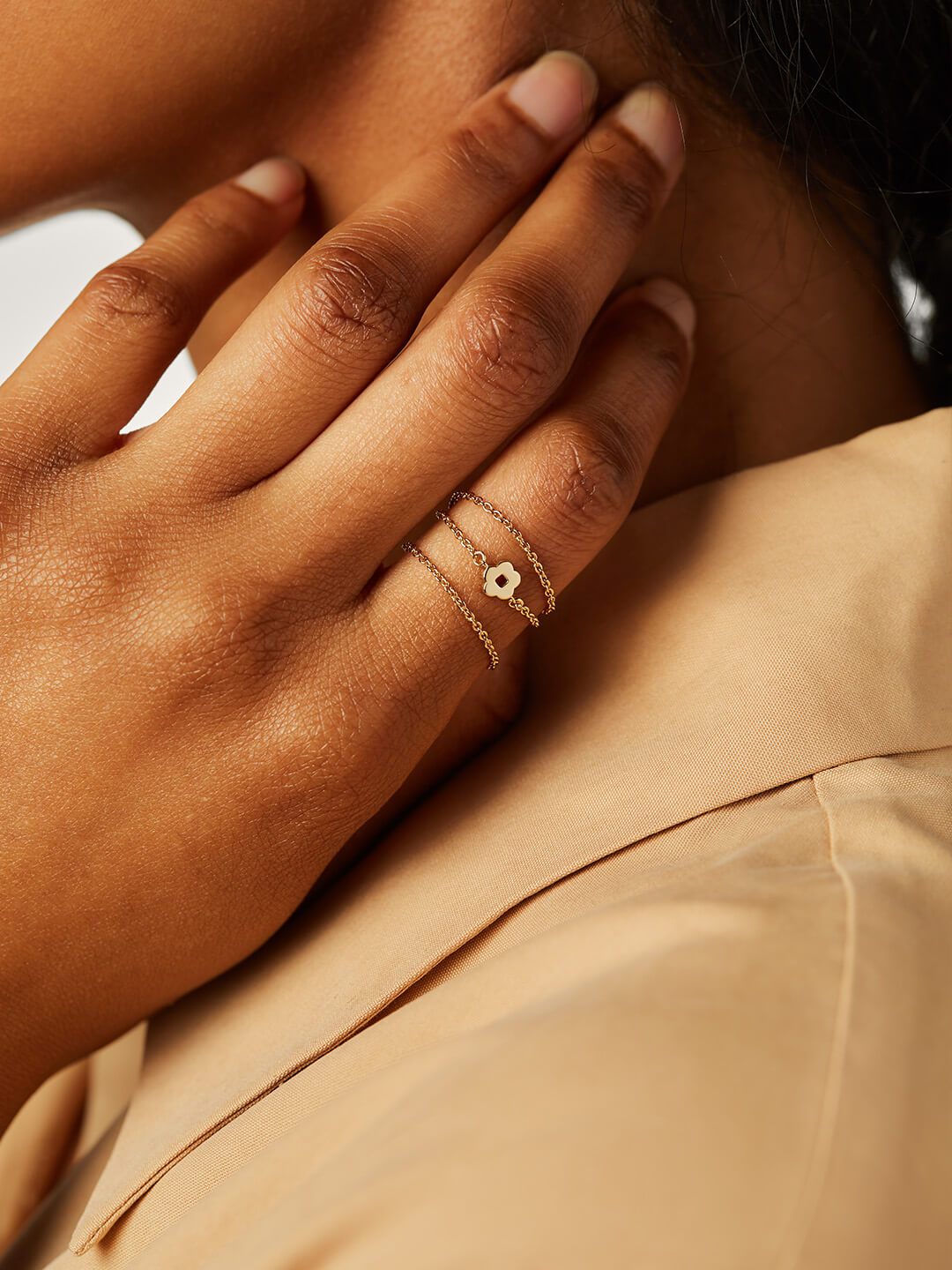 Less is more with this set of three delicate and dainty stacking chain rings composed of two minimal gold chains and a minimal flower detail chain! We recommend sizing up for this set. Artistically handcrafted and dipped in 14k gold, these link chain stacking rings will dress up your finger in a unique way. Add them to your jewelry collection before they’re gone.